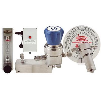 Three pressure regulators are offered, suitable for inlet pressures up to 20 bars and 400 bars. In all cases the metal parts exposed to the sample gas are stainless steel. The small regulator is capable of reducing the sample gas to 1 bar pressure in a single stage, but with difficult gases like CO2 it is advisable to connect two regulators in series to give two stage reduction. Supplied with fittings for 1/8" od copper or stainless steel piping. Fittings also available for 1/4" or 6mm pipe on request.